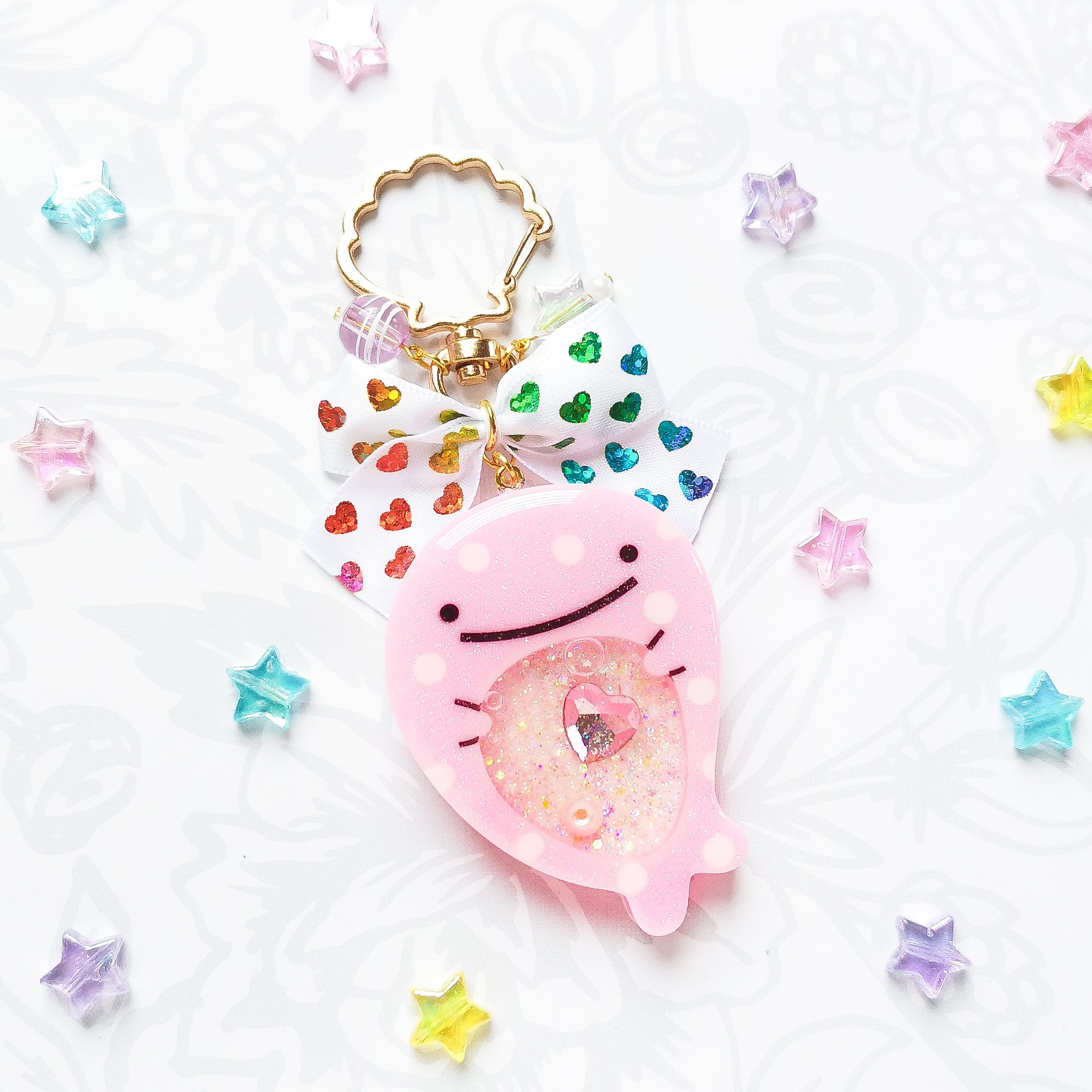 Jinbesan has a body and heart as big as the ocean. So i put a little heart rhinestone inside with little bubble beads and various glitter. Decorated with a rainbow star/heart ribbon and some beads on a seashell clasp. The spots on the body glows in the dark too!✨